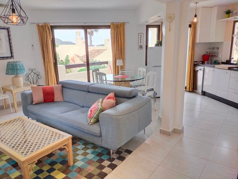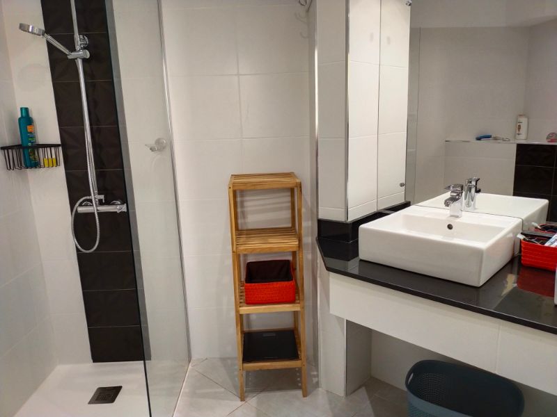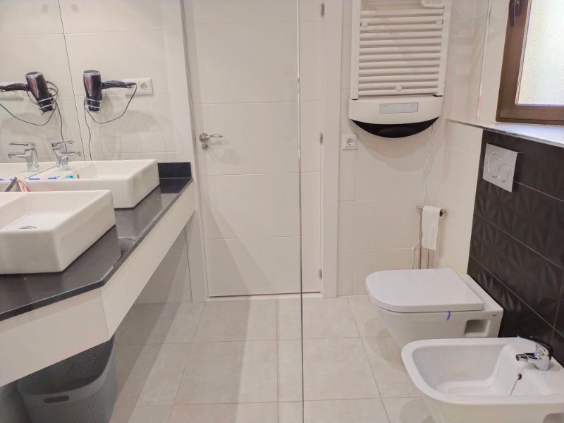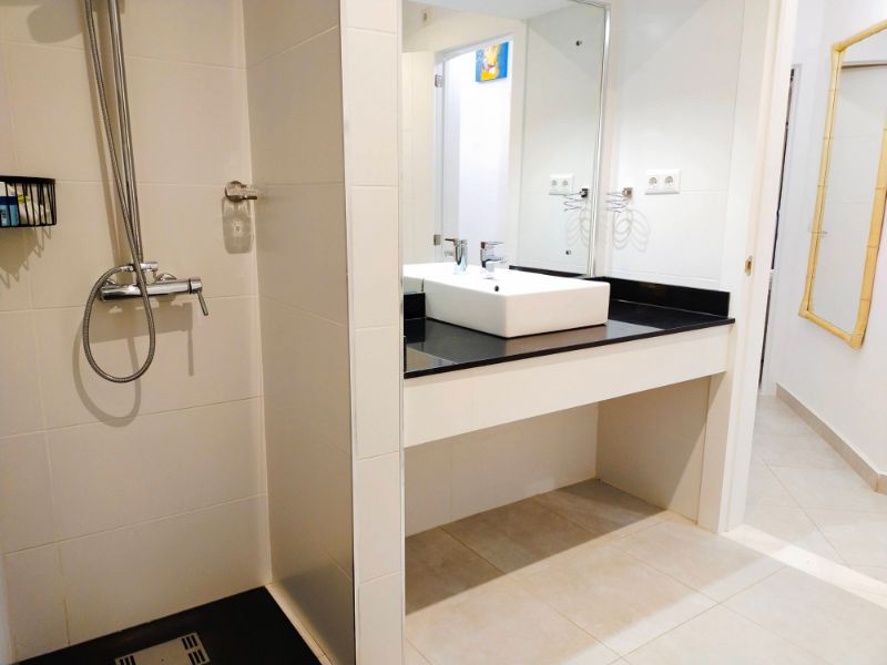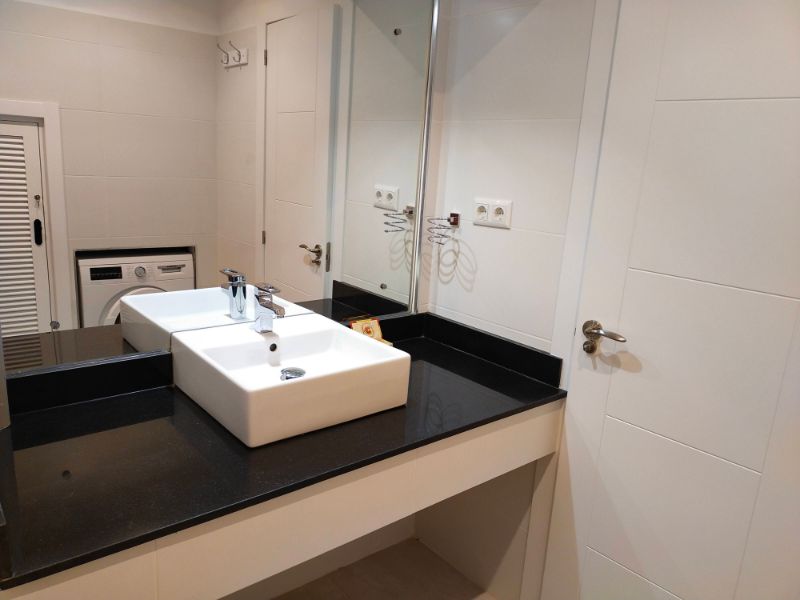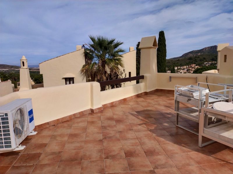 El baño independiente tiene ducha, lavabo individual y WC. El baño del dormitorio principal tiene ventana, ducha, lavabo doble, inodoro y bidé. Al lado de la puerta principal hay un armario de almacenamiento debajo de la escalera que conduce a la azotea solarium desde donde se puede ver el Mar Menor y parte del resort.