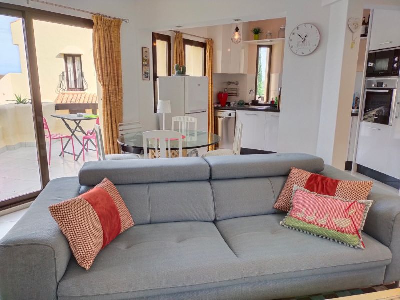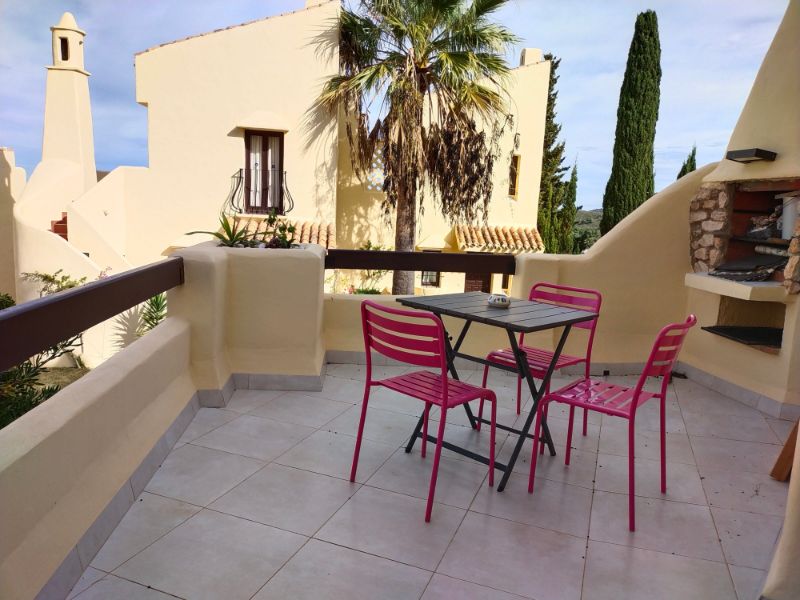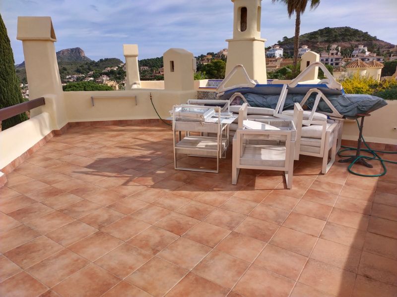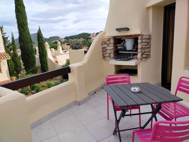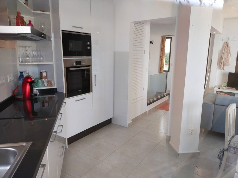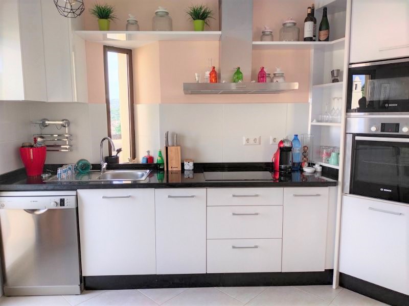 Tanto desde el comedor como desde la cocina se accede a la terraza delantera. Esta terraza tiene espacio para mesa y sillas y hay una barbacoa de obra recientemente mejorada con encimera de trabajo. La cocina es moderna y está bien equipada con vitrocerámica, horno, microondas, frigorífico y lavavajillas.